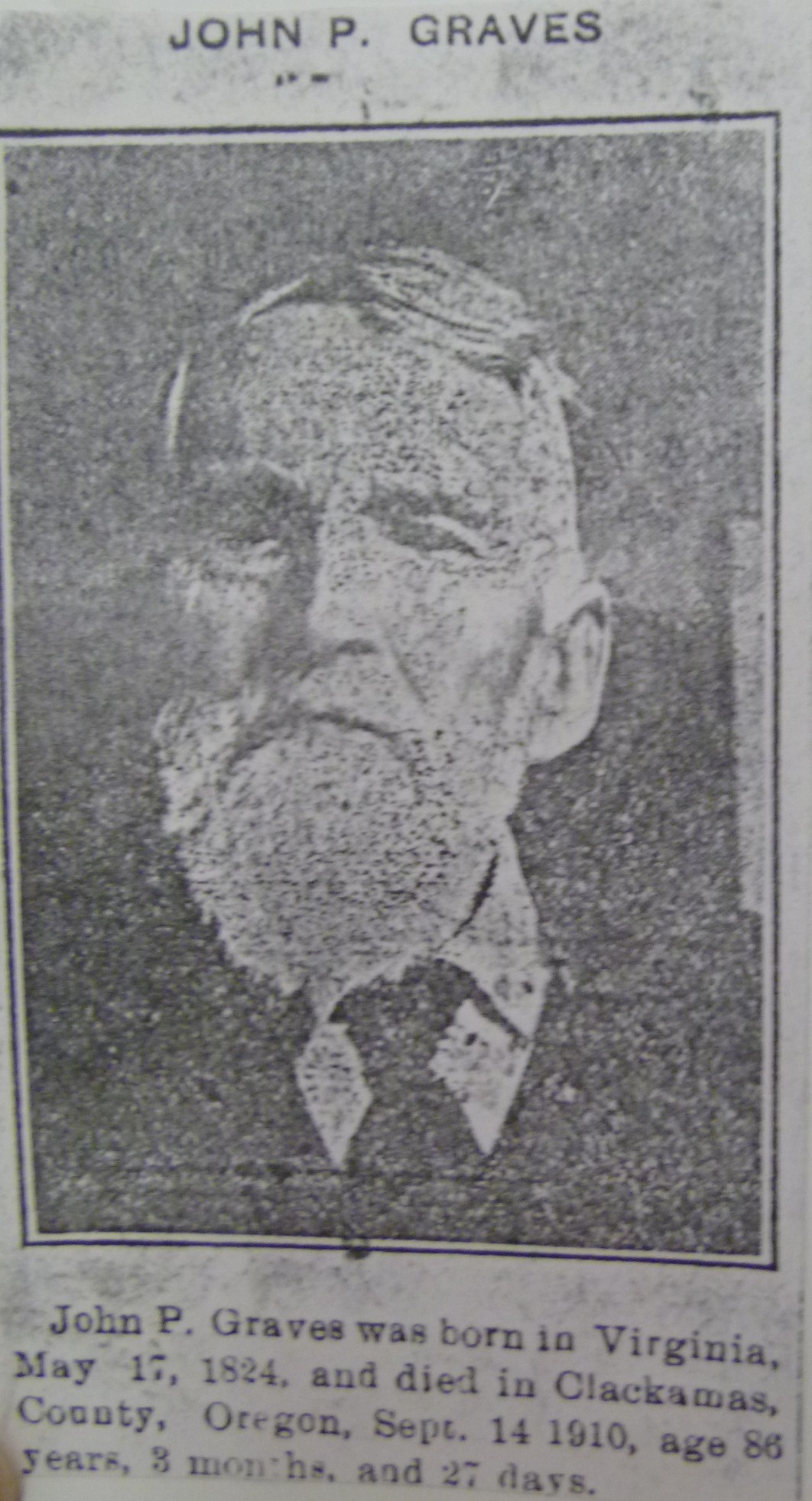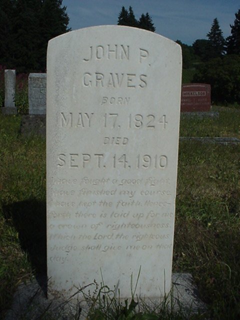 John Pinkard Graves died 14 September 1910, Marion County, Oregon at age 86 years, 3 months and 28 days and was buried Miller Cemetery, Marion County, Oregon.